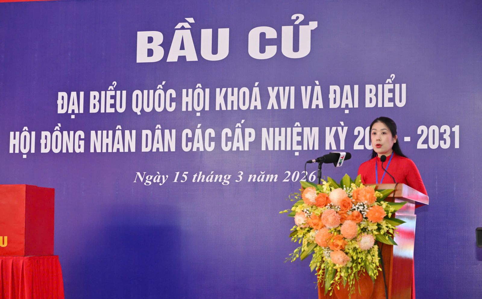 Bà Đỗ Thị Thu Trang - Tổ trưởng Tổ bầu cử số 3 đọc diễn văn khai mạc