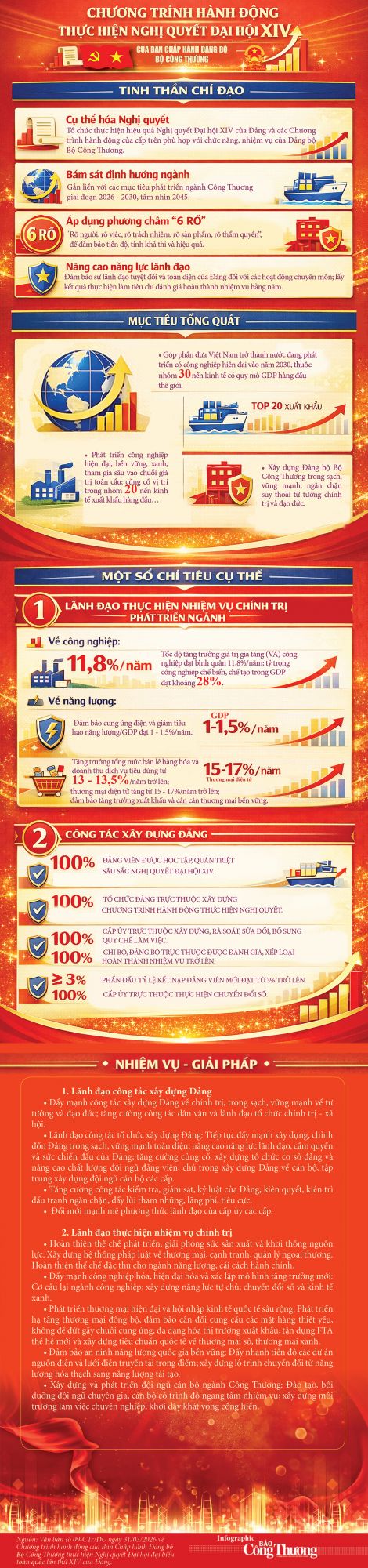 Tại Văn bản số 09-CTr/ĐU ngày 31/03/2026, Đảng ủy Bộ Công Thương đã ban hành Chương trình hành động của Ban Chấp hành Đảng bộ Bộ Công Thương thực hiện Nghị quyết Đại hội XIV của Đảng.