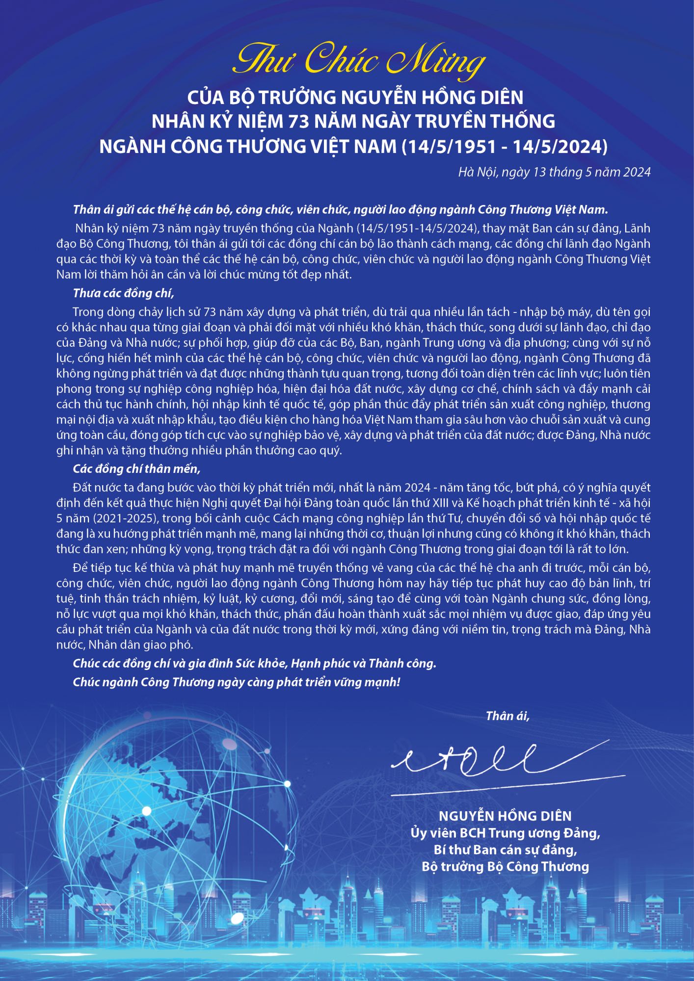 Nhân dịp 73 năm Ngày Truyền thống của ngành Công Thương Việt Nam (14/5/1951- 14/5/2024), thay mặt Ban Cán sự Đảng, Lãnh đạo Bộ Công Thương, Bộ trưởng Nguyễn Hồng Diên gửi tới các thế hệ cán bộ, công chức, viên chức và người lao động ngành Công Thương Việt Nam lời thăm hỏi ân cần, lời chúc mừng nồng nhiệt và những tình cảm tốt đẹp nhất. Cổng Thông tin điện tử Bộ Công Thương trân trọng giới thiệu toàn văn thư chúc mừng của Bộ trưởng: