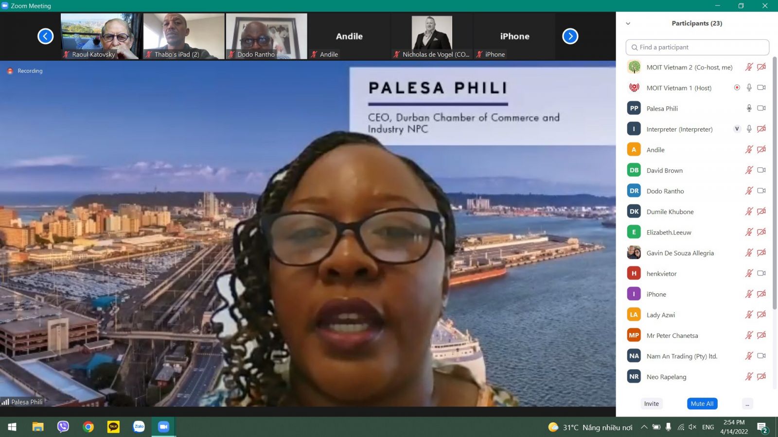 Về phía Nam Phi, Bà Palesa Phili, Chủ tịch Phòng Thương mại và Công nghiệp Durban, Nam Phi bày tỏ sự vui mừng và mong muốn được thúc đẩy quan hệ hợp tác với các đối tác Việt Nam. Tỉnh Durban, Nam Phi với cảng Richards Bay là cửa ngõ lớn nhất chuyên phục vụ xuất khẩu than của Nam Phi. Các doanh nghiệp cung ứng và kinh doanh than Nam Phi đều đặt Văn phòng, Chi nhánh tại đây để thuận tiện giao dịch và xử lý các vấn đề liên quan tới xuất nhập khẩu tại cảng Richards Bay. Bà Palesa Phili khẳng định sẽ ủng hộ và tích cực thúc đẩy việc kết nối, giới thiệu các đối tác, hỗ trợ doanh nghiệp Việt Nam nhập khẩu than từ Nam Phi trong thời gian tới.
