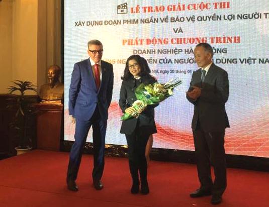 Thứ trưởng Trần Quốc Khánh (ngoài cùng, phải) tặng hoa chúc mừng tác giả đạt giải cuộc thi "Xây dựng đoạn phim về bảo vệ quyền lợi người tiêu dùng"