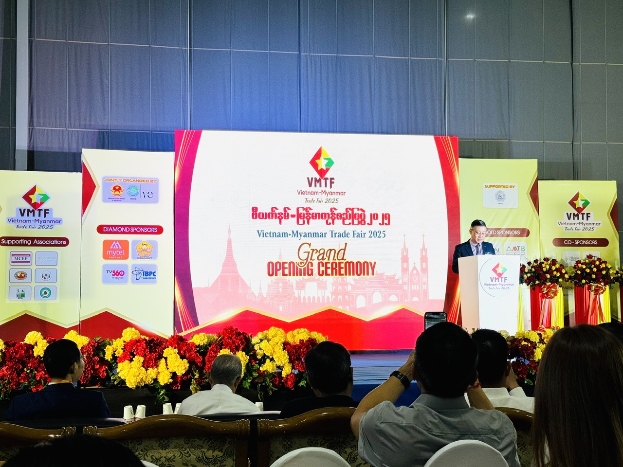 Lễ khai mạc Hội chương Thương mại Việt Nam - Myanmar 2025 đã được tổ chức long trọng vào sáng ngày 10/10/2025 tại Yangon Convention Centre, Yangon. Tham dự và phát biểu tại Lễ khai mạc có Đại sứ Việt Nam tại Myanmar Lý Quốc Tuấn, Chủ tịch Liên đoàn các Phòng Thương mại và Công nghiệp Myanmar (UMFCCI), Cục trưởng Cục Xúc tiến Thương mại Myanmar (Myantrade). Ngoài ra, Lãnh đạo Liên đoàn các Nhà xây dựng Myanmar (MCEF), Trung tâm Thúc đẩy Kinh doanh quốc tế (ITPC) và các hiệp hội, giới doanh nghiệp Myanmar đã tham dự.
