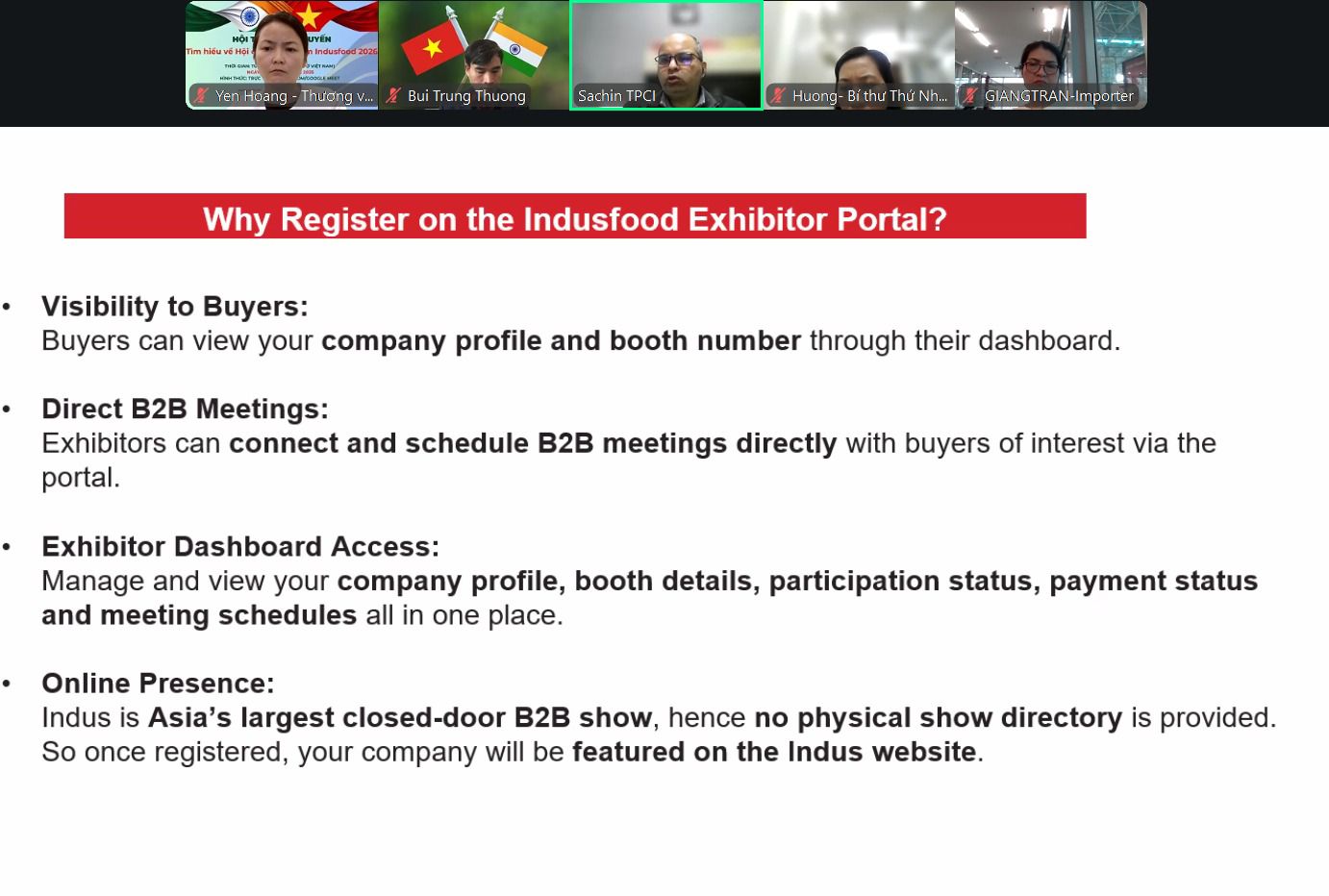 Chiều 17/12/2025, Thương vụ Việt Nam tại Ấn Độ phối hợp với Hội đồng Xúc tiến Thương mại Ấn Độ tổ chức hội thảo trực tuyến “Hợp tác Việt Nam – Ấn Độ trong lĩnh vực thực phẩm và đồ uống tại Indusfood 2026” nhằm cung cấp thông tin và cơ hội và tiềm năng hợp tác cho doanh nghiệp Việt Nam thông qua Hội chợ Indusfood 2026 - một trong những hội chợ thực phẩm – đồ uống lớn nhất khu vực Nam Á.