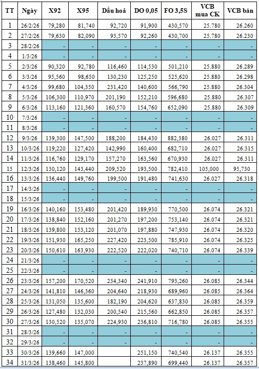 (Chi tiết tại bảng thống kê giá thành phẩm xăng dầu thế giới kèm theo)