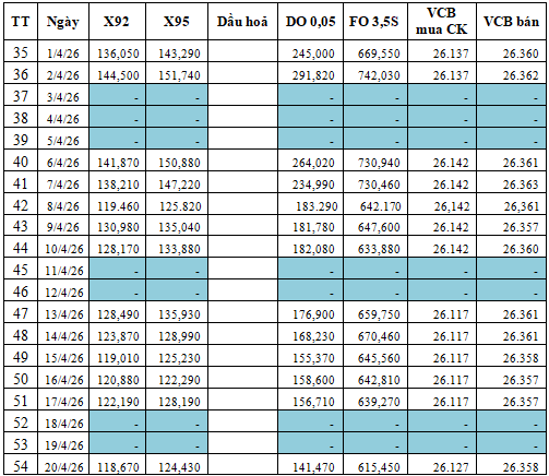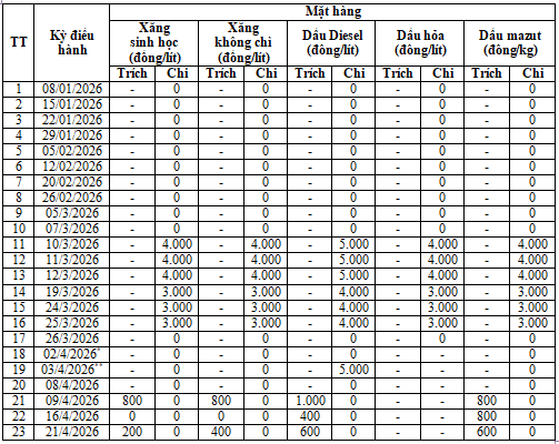- Điều chỉnh giá bán các mặt hàng xăng dầu: Do thương nhân đầu mối kinh doanh xăng dầu, thương nhân phân phối xăng dầu quy định nhưng không muộn hơn 16 giờ 00’ ngày 21 tháng 4 năm 2026.