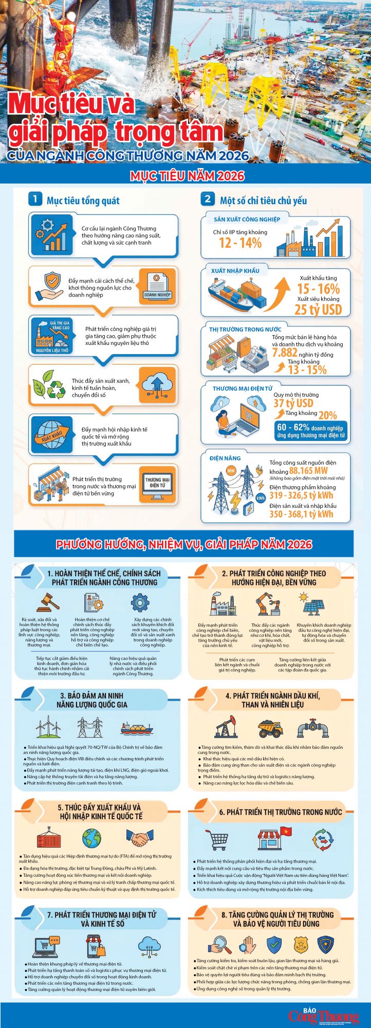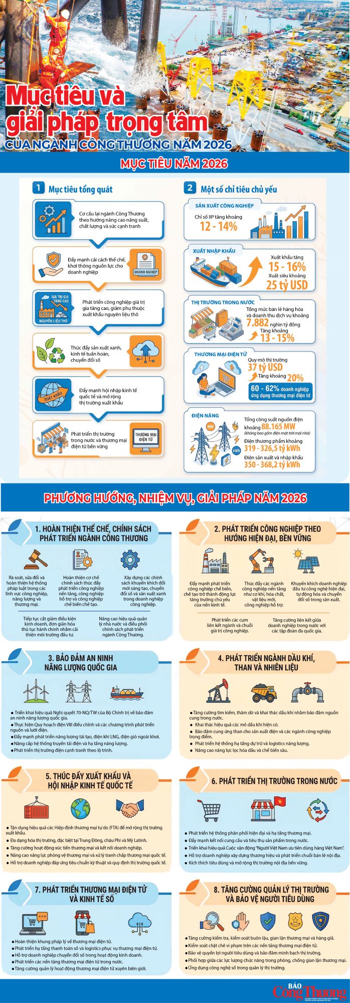 Năm 2026, ngành Công Thương đặt mục tiêu tăng trưởng mạnh về sản xuất công nghiệp, xuất khẩu và thị trường nội địa, đồng thời triển khai đồng bộ các giải pháp hoàn thiện thể chế, bảo đảm an ninh năng lượng, thúc đẩy chuyển đổi số, tạo nền tảng cho phát triển nhanh, bền vững.