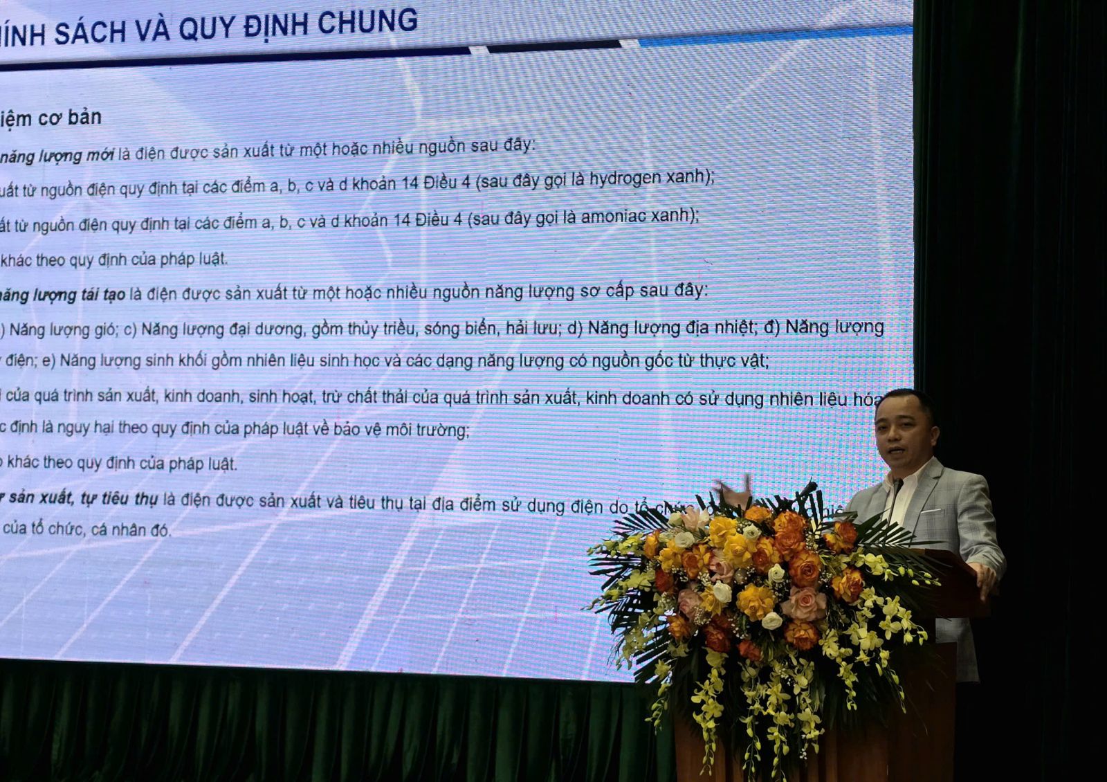 Phát biểu tại hội thảo, ông Trần Hoài Trang – Phó Cục trưởng Cục Điện lực, Bộ Công Thương cho biết: Ngày 8/5/2025 Chính phủ đã ban hành Nghị định số 58/2025/NĐ-CP của Chính phủ quy định chi tiết một số điều của Luật Điện lực về phát triển điện năng lượng tái tạo, điện năng lượng mới trong đó đã xây dựng các chính sách khuyến khích và quy định rõ về trình tự, thủ tục lắp đặt điện mặt trời mái nhà tự sản xuất, tự tiêu thụ.