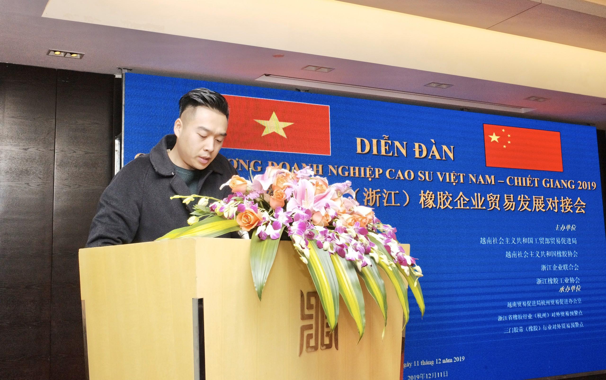 Đại diện Bộ Công Thương ông Hoàng Minh Chiến, Phó Cục trưởng Cục xúc tiến thương mại đánh giá cao hiệu quả của công tác xúc tiến thương mại quốc gia, công tác hỗ trợ doanh nghiệp của Văn phòng xúc tiến thương mại Việt Nam tại Hàng Châu. Khẳng định Bộ Công Thương luôn luôn đồng hành cùng doanh nghiệp, đặc biệt là các doanh nghiệp cao su trong công tác xúc tiến thương mại, mở cửa và phát triển thị trường. Bộ Công Thương luôn quan tâm chỉ đạo Cục Xúc tiến thương mại tạo điều kiện thuận lợi để các doanh nghiệp cao su Việt Nam, Hiệp hội cao su Việt Nam tham gia các chương trình xúc tiến thương mại quốc gia. Chỉ đạo các cơ quan đại diện thương mại, xúc tiến thương mại Việt Nam tại nước ngoài tăng cường công tác quảng bá, cung cấp thông tin cho doanh nghiệp. Phát huy vai trò của cơ quan xúc tiến thương mại tại địa bàn sở tại, kịp thời cung cấp thông tin, tư vấn thông tin cho doanh nghiệp hai bên, thể hiện vai trò là cầu nối về chính sách, quy định giữa cơ quan quản lý nhà nước và cộng đồng doanh nghiệp, phục vụ doanh nghiệp hai bên phát triển bền vững mối quan hệ thương mại. Khẳng định Bộ Công Thương Việt Nam luôn ủng hộ kịp thời và hỗ trợ doanh nghiệp hai bên phát triển, thiết lập quan hệ đầu tư lẫn nhau, phát triển quan hệ thương mại bền vững.
