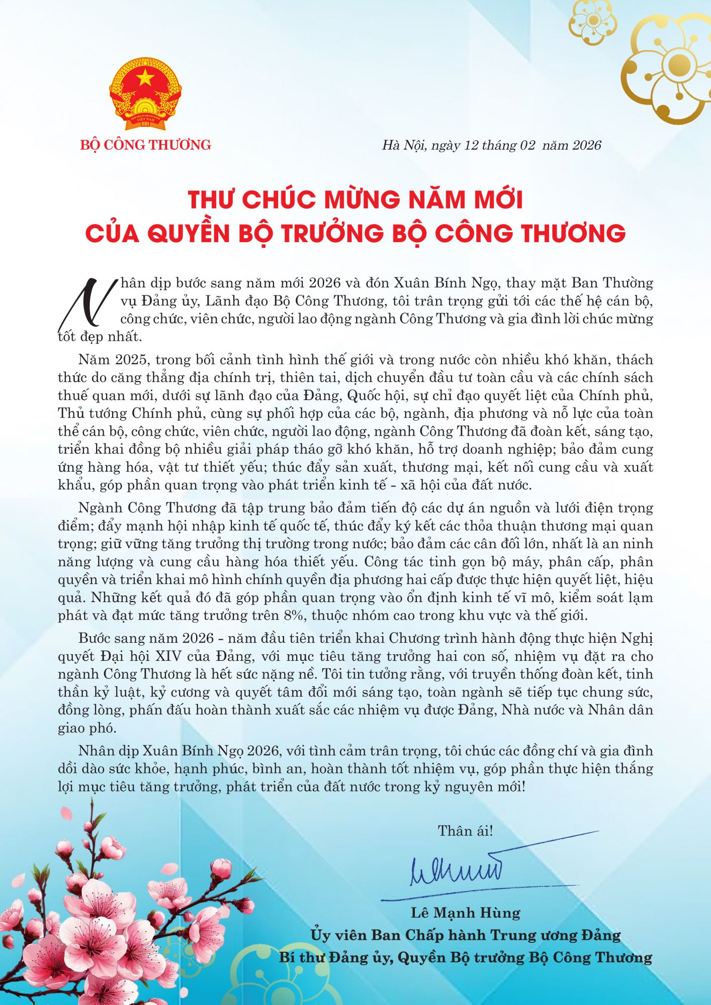Nhân dịp bước sang năm mới 2026 và đón Xuân Bính Ngọ, thay mặt Ban Thường vụ Đảng ủy, Lãnh đạo Bộ Công Thương, Quyền Bộ trưởng Lê Mạnh Hùng trân trọng gửi tới các thế hệ cán bộ, công chức, viên chức, người lao động ngành Công Thương và gia đình lời chúc mừng tốt đẹp nhất.