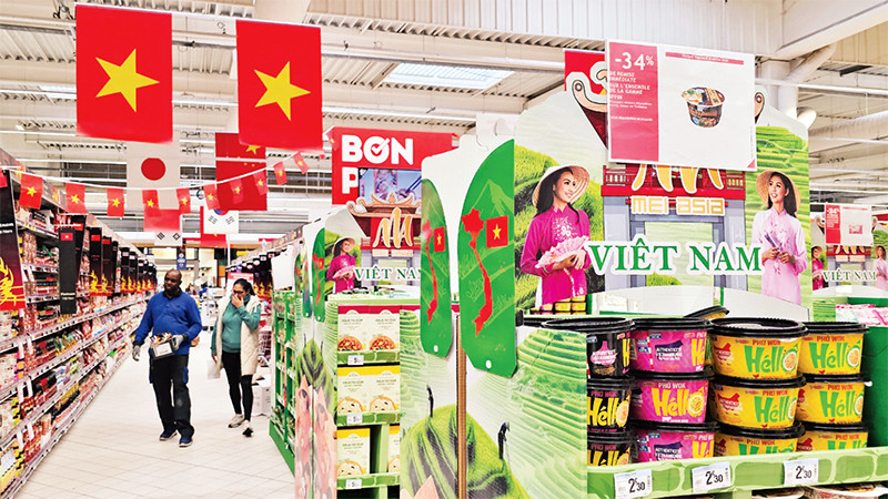 Hàng Việt Nam trưng bày tại siêu thị Carrefour ở Pháp - ảnh: Báo Nhân dân