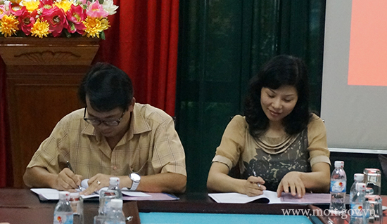 | Ông Nguyễn Thế Quang, Phó Cục trưởng Cục TMĐT và CNTT và Bà Lê Hải An, Phó Hiệu trưởng Trường ĐTBD cán bộ Công Thương TW kí Biên bản Ghi nhớ |