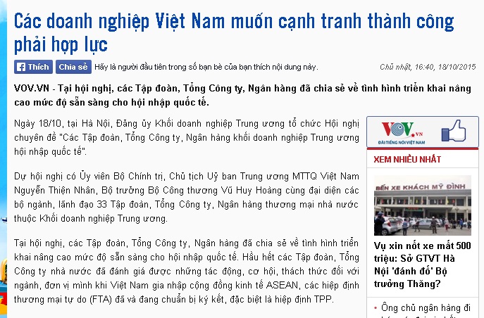 Là thông tin được đăng tải trên báo Đài tiếng nói Việt Nam điện tử ngày 18/10/2015. Theo đó, ngày 18/10, tại Hà Nội, Đảng ủy Khối doanh nghiệp Trung ương tổ chức Hội nghị chuyên đề "Các Tập đoàn, Tổng công ty, Ngân hàng khối doanh nghiệp Trung ương hội nhập quốc tế”.