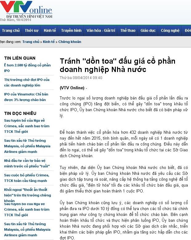 "Tránh "dồn toa" đấu giá cổ phần doanh nghiệp Nhà nước" là bài viết đăng trên báo điện tử Đài truyền hình Việt Nam, ngày 8/4/2014. Bài viết đã xoa dịu phần nào nỗi lo của các doanh nghiệp nhà nước trong tiến trình cổ phần hóa cấp bách hiện nay.