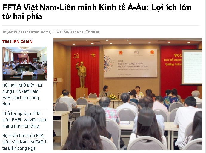 Báo điện tử Vietnamplus ngày 7/7/2015 đưa thông tin: "FTA Việt Nam-Liên minh Kinh tế Á-Âu: Lợi ích lớn từ hai phía". Theo đó, ngày 7/7, tại Hà Nội, Bộ Công Thương, Bộ Tài chính và Phòng Thương mại và Công nghiệp Việt Nam tổ chức giới thiệu Hiệp định Thương mại tự do (FTA) Việt Nam-Liên minh Kinh tế Á-Âu (EAEU). Theo bà Nguyễn Khánh Ngọc, Vụ Thị trường châu Âu, Bộ Công Thương, Liên minh này có 4 thành viên chính thức là Nga, Belarus, Kazakhstan và Armenia. Một nước khác là Kyrgyzstan hiện đang trong giai đoạn phê chuẩn để trở thành thành viên chính thức.