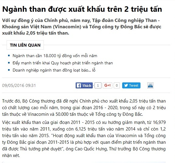 Thứ hai, ngày 09/5/2016, trên Báo đầu tư, tác giả Thanh Hương cho biết: với sự đồng ý của Chính phủ, năm nay, Tập đoàn Công nghiệp Than - Khoáng sản Việt Nam (Vinacomin) và Tổng công ty Đông Bắc sẽ được xuất khẩu 2,05 triệu tấn than.