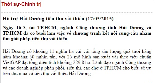 Cũng liên quan đến đẩy mạnh tiêu thụ vải thiều vụ mùa năm 2015, báo Đại Đoàn kết điện tử ngày 17/5/2015 đưa tin: “Hỗ trợ Hải Dương tiêu thụ vải thiều”. Theo đó, Ngày 16/5, tại TP.HCM, ngành Công Thương tỉnh Hải Dương và TP.HCM đã có buổi làm việc về chương trình kết nối cung-cầu nhằm tìm giải pháp tiêu thụ vải thiều.