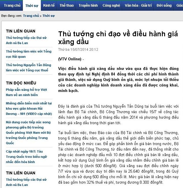 Thứ ba, ngày 15/7/2014, Báo điện tử Đài truyền hình Việt Nam đưa tin về buổi làm việc của Thủ tướng Chính phủ Nguyễn Tấn Dũng và Bộ Công Thương, Bộ Tài chính về điều hành giá xăng, dầu qua bài viết có nhan đề "Thủ tướng chỉ đạo về điều hành giá xăng dầu".