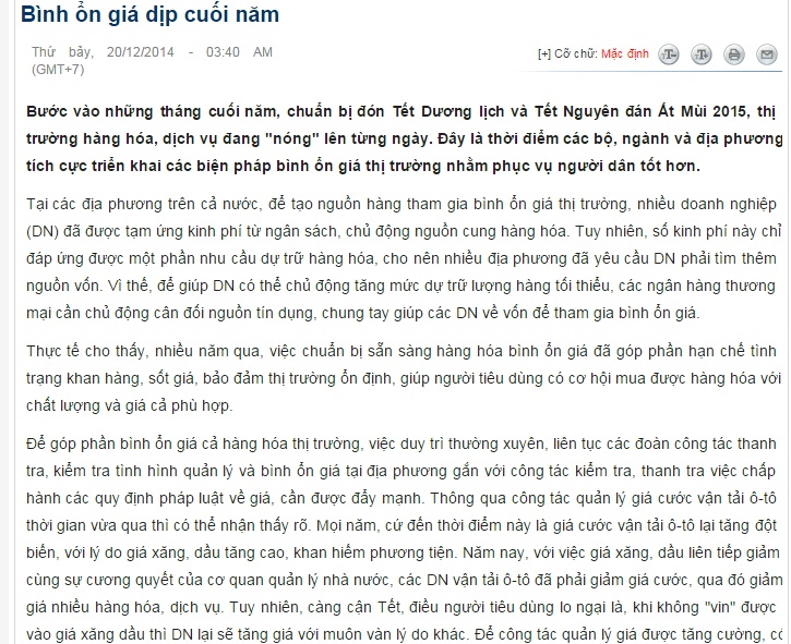 Ngày 20/12/2014, báo Nhân Dân điện tử thông tin về: “Bình ổn giá dịp cuối năm”. Bước vào những tháng cuối năm, chuẩn bị đón Tết Dương lịch và Tết Nguyên đán Ất Mùi 2015, thị trường hàng hóa, dịch vụ đang “nóng” lên từng ngày. Đây là thời điểm các bộ, ngành và địa phương tích cực triển khai các biện pháp bình ổn giá thị trường nhằm phục vụ người dân tốt hơn.