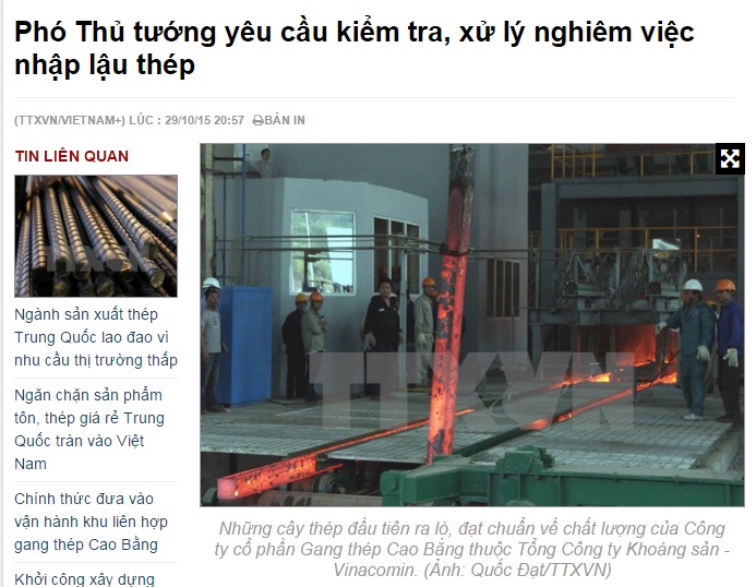 Là thông tin được đăng tải trên Vietnamplus ngày 29/10/2015. Theo đó, văn phòng Chính phủ vừa có thông báo kết luận của Phó Thủ tướng Hoàng Trung Hải tại cuộc họp về tình hình nhập lậu thép vào Việt Nam.