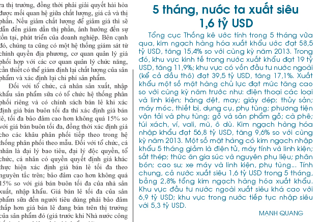 "5 tháng đầu năm, kim ngạch hàng hóa xuất khẩu đạt 58,5 tỷ USD" là nhan đề bài viết đăng trên trang 2, báo Đại biểu Nhân dân số 149 ra ngày 29/5 vừa qua. Theo Tổng cục Thống kê, kim ngạch hàng hóa xuất khẩu trong 5 tháng đầu năm ước đạt 58,5 tỷ USD, tăng 15,4% so với cùng kỳ.