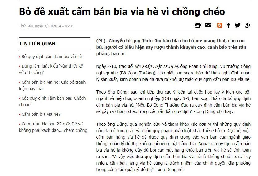 Qua nghiên cứu và tham khảo các đơn vị thì những quy định nào đã có trong các văn bản quy phạm pháp luật khác thì sẽ bỏ ra. Cụ thể, việc cấm bán hàng vỉa hè đã được quy định trong các văn bản của ngành giao thông, quản lý đô thị, không chỉ riêng mặt hàng bia. Ngoài ra quy định cấm bán bia vỉa hè là không đầy đủ bởi các mặt hàng khác bán trên vỉa hè sẽ tính toán ra sao.