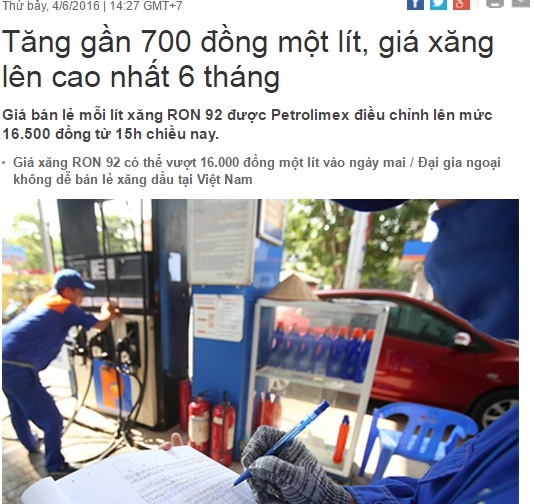 Ngày 04/6, Báo điện tử VnExpress cho biết: giá bán lẻ mỗi lít xăng RON 92 được Petrolimex điều chỉnh lên mức 16.500 đồng từ 15h chiều ngày 04/6/2016.