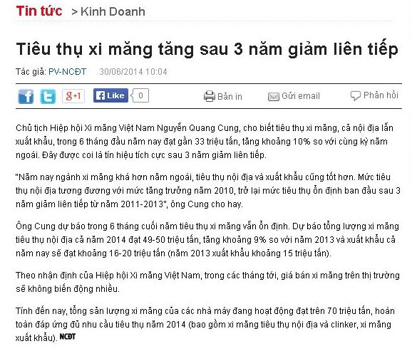 Đó là tín hiệu vui của ngành xi măng Việt Nam được Báo điện tử Nhịp cầu đầu tư thông tin ngày 30/6/2014.