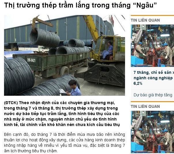 Là nhận định của Báo Đầu tư Chứng khoán điện tử ngày 5/8. Theo nhận định của các chuyên gia thương mại, trong tháng 7 và tháng 8, thị trường thép xây dựng trong nước dự báo tiếp tục trầm lắng, tình hình tiêu thụ của các nhà máy ở mức chậm, nguyên nhân chủ yếu do tình hình kinh tế, tài chính vẫn khó khăn nên chưa kích cầu tiêu thụ.