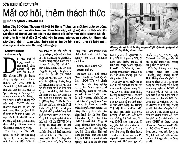 Trang 3, Báo Lao Động, số 237 ra ngày 10/10 có bài viết: “Công nghiệp hỗ trợ tụt hậu: Mất cơ hội, thêm thách thức”. Bài báo cho hay, Giám đốc Sở Công Thương Hà Nội Lê Hồng Thăng tại một hội thảo về công nghiệp hỗ trợ mới đây trăn trở: Thời bao cấp, công nghiệp Hà Nội nổi lên Công ty điện tử Hanel với sản phẩm tivi Hanel nổi tiếng một thời. Nhưng khi đó, chúng ta làm từ A đến Z và chủ yếu là cung cấp trong nước. Khi tham gia vào chuỗi giá trị toàn cầu, nhiều sản phẩm có tiếng một thời đã biến mất, nhường chỗ cho các thương hiệu ngoại.