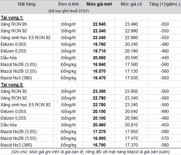 Mức giá mới có hiệu lực thi hành từ thời điểm 18 giờ 00 ngày 23/10/2014 cho đến khi có thông báo mới.