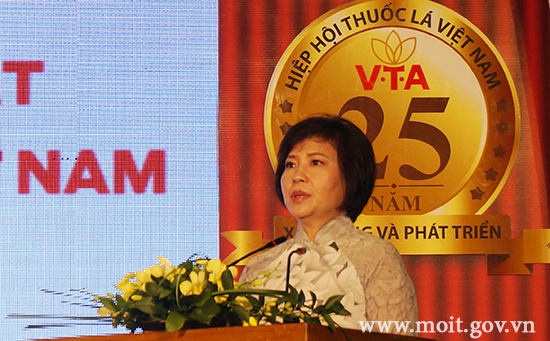 Phát biểu tại buổi lễ, Thứ trưởng Bộ Công Thương Hồ Thị Kim Thoa đã nhiệt liệt biểu dương và đánh giá cao những thành tích của Hiệp hội Thuốc lá Việt Nam trong những năm qua và nhấn mạnh Hiệp hội Thuốc lá là một trong những hiệp hội ngành nghề ra đời sớm và hoạt động có hiệu quả trong ngành Công Thương.