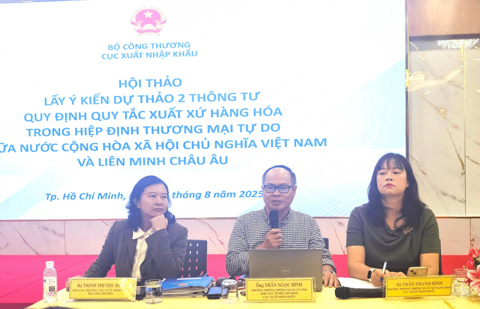 Sáng ngày 07/8/2025 tại TP. Hồ Chí Minh, Cục Xuất nhập khẩu (Bộ Công Thương) tổ chức Hội thảo lấy ý kiến Dự thảo 2 Thông tư quy định Quy tắc xuất xứ hàng hóa trong Hiệp định Thương mại tự do giữa Nước Cộng hòa Xã hội Chủ nghĩa Việt Nam và Liên minh châu Âu (EVFTA).