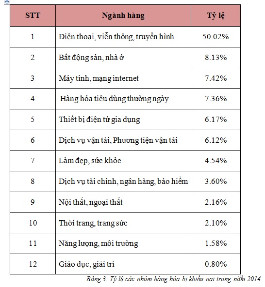 Năm 2014 ghi nhận tình hình khiếu nại rất đa dạng về các ngành hàng, trong đó, các khiếu nại liên quan đến điện thoại, viễn thông, truyền hình chiếm tỷ lệ cao nhất là 50.02%. Con số này vừa phản ánh số lượng vụ việc vi phạm liên quan nhưng đồng thời cũng phần nào phản ánh sự phát triển sôi động và phức tạp của lĩnh vực này. Nhóm thứ hai là với số lượng từ 3,6 cho đến 8,13% là các lĩnh vực như: Bất động sản, nhà ở, máy tính, mạng internet, hàng hóa tiêu dùng hàng ngày, thiết bị điện tử gia dụng, dịch vụ và phương tiện vận tải, làm đẹp, sức khỏe, dịch vụ tài chính, ngân hàng và bảo hiểm. Nhóm thứ 3 là các lĩnh vực có số lượng khiếu nại từ 0,8 đến 2,1%, bao gồm: nội ngoại thất, thời trang, trang sức, năng lượng, môi trường, giáo dục, giải trí.
