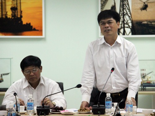| Ủy viên T.Ư Đảng, Phó ban Kinh tế T.Ư Phạm Xuân Đương cùng Chủ tịch HĐTV Tập đoàn Nguyễn Xuân Sơn (đứng) chủ trì buổi làm việc tại PV Shipyard |