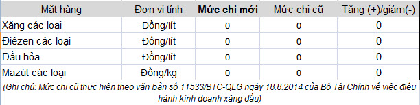 Theo văn bản số 12143/BTC-QLG ngày 29/8/2014 của Bộ Tài chính về việc điều hành kinh doanh xăng dầu, mức chi sử dụng Quỹ Bình ổn giá (BOG) áp dụng từ 12 giờ 00 ngày 29/8/2014 cụ thể như sau: