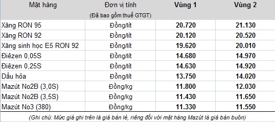Mức giá mới có hiệu lực từ thời điểm 15 giờ 00 ngày 20 tháng 7 năm 2015 cho đến khi có thông cáo báo chí (TCBC) mới.