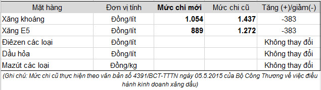 Theo văn bản số 4972/BCT-TTTN của Bộ Công Thương về việc điều hành kinh doanh xăng dầu, mức chi sử dụng Quỹ bình ổn giá xăng dầu (BOG) từ 20 giờ 00 ngày 20/5/2015 như sau:
