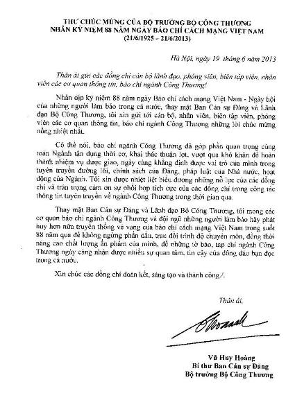Nhân kỷ niệm 88 năm ngày Báo chí cách mạng Việt Nam (21/6/1925 - 21/6/2013), Bộ trưởng Bộ Công Thương Vũ Huy Hoàng đã có thư chúc mừng gửi tới các đồng chí lãnh đạo, phóng viên, biên tập viên, nhân viên các cơ quan thông tin, báo chí ngành Công Thương.