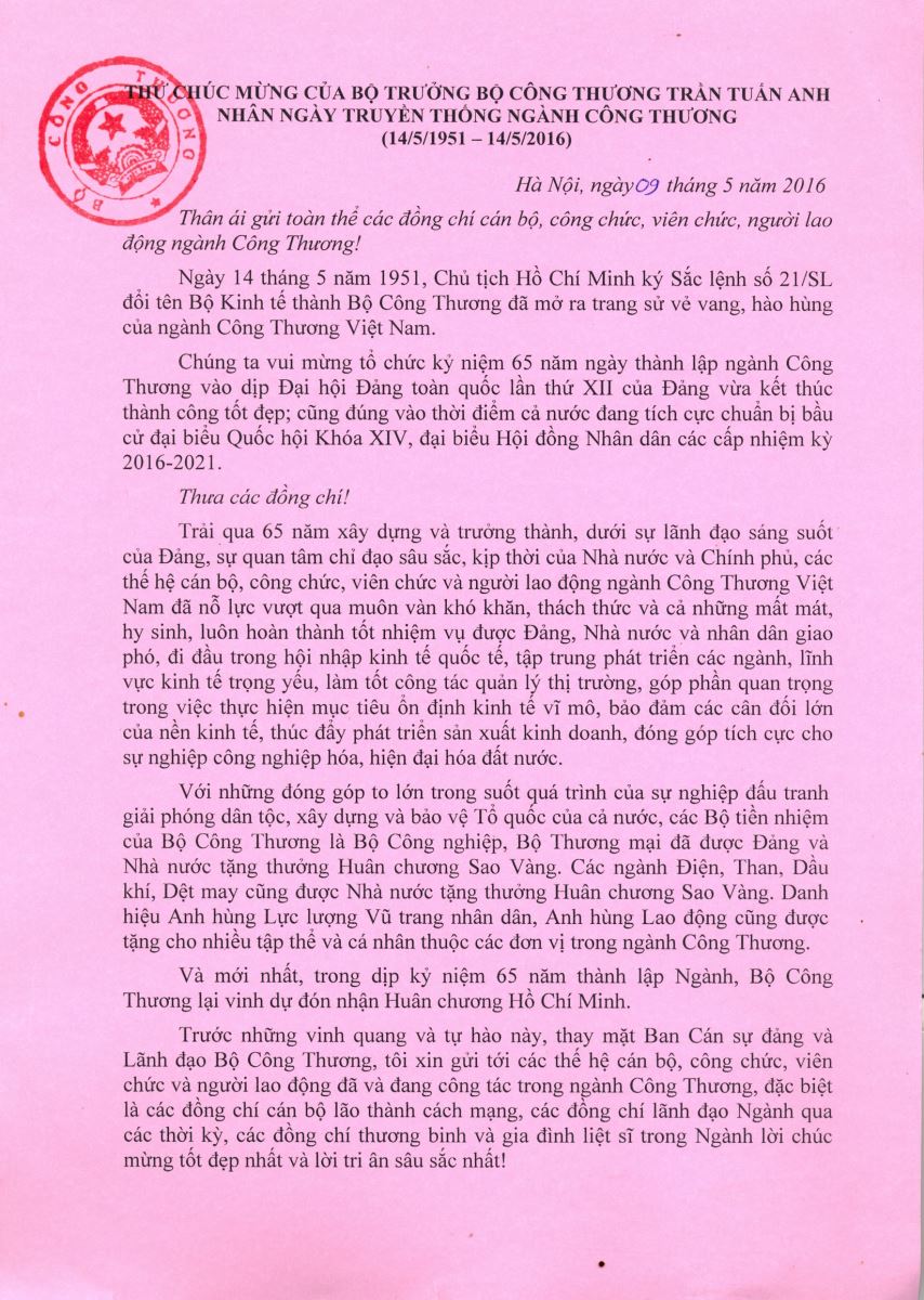 Trước những vinh quang và tự hào của Chặng đường 65 năm ngành Công Thương, thay mặt Ban cán sự đảng, Lãnh đạo Bộ Công Thương, Bộ trưởng Trần Tuấn Anh đã gửi tới các thế hệ cán bộ, công chức và người lao động đã và đang công tác trong ngành Công Thương, đặc biệt là các đồng chí cán bộ lão thành cách mạng, các đồng chí lãnh đạo Ngành qua các thời kỳ, các đồng chí thương binh và gia đình liệt sĩ trong Ngành lời chúc mừng tốt đẹp nhất và lời tri ân sâu sắc nhất.