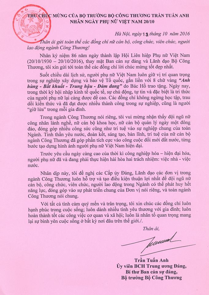 Nhân kỷ niệm 86 năm ngày thành lập Hội Liên hiệp Phụ nữ Việt Nam (20/10/1930 - 20/10/2016), thay mặt Ban cán sự Đảng và Lãnh đạo Bộ Công Thương, Bộ trưởng Trần Tuấn Anh đã có thư chúc mừng gửi tới toàn thể nữ cán bộ, công chức, viên chức, người lao động ngành Công Thương.