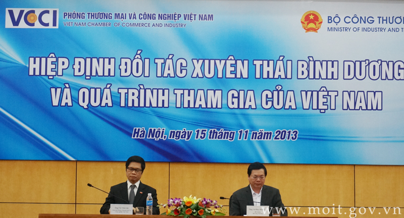 Ngày 15/11/2013, Bộ Công Thương phối hợp cùng Phòng Thương mại và Công nghiệp Việt Nam (VCCI) đã đồng tổ chức Hội nghị với chủ đề “Hiệp định đối tác xuyên Thái Bình Dương và quá trình tham gia của Việt Nam”. Bộ trưởng Bộ Công Thương Vũ Huy Hoàng, Thứ trưởng Trần Quốc Khánh - Trưởng đoàn đàm phán Chính phủ về kinh tế và thương mại quốc tế, ông Vũ Tiến Lộc - Chủ tịch Phòng Thương mại và Công nghiệp Việt Nam đã chủ trì Hội nghị.