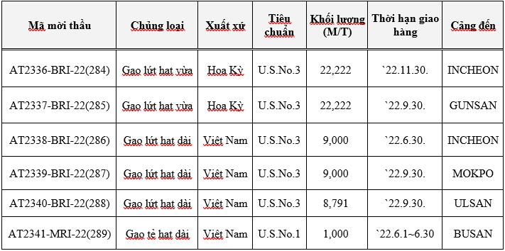 Đợt đầu thầu tháng 02/2022, Hàn Quốc thông báo mở thầu mua 27.791 tấn gạo từ Việt Nam (gồm cả gạo lứt hạt dài và gạo tẻ hạt dài). Cụ thể như sau: