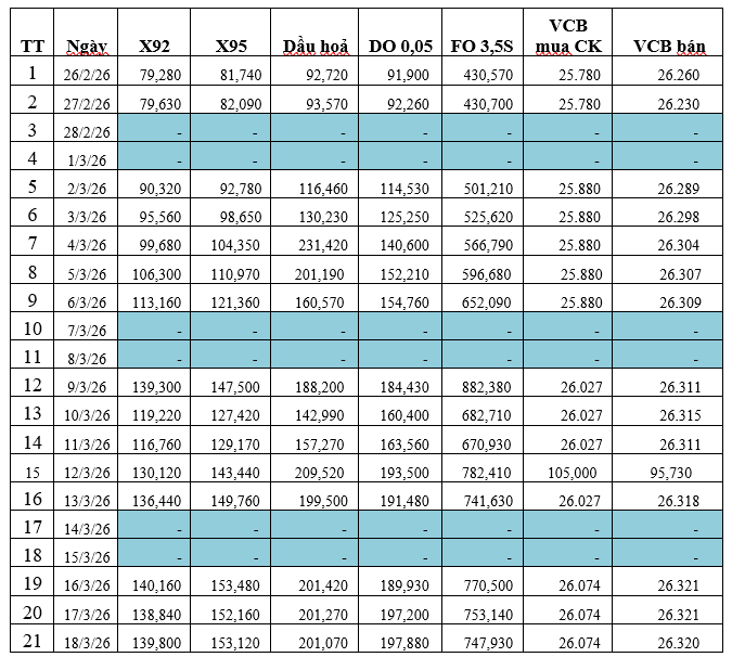 Bình quân giá thành phẩm xăng dầu thế giới giữa kỳ điều hành giá ngày 12/3/2026 và kỳ điều hành ngày 19/3/2026 là: 137,072 USD/thùng xăng RON92 dùng để pha chế xăng E5RON92 (tăng 20,312 USD/thùng, tương đương tăng 17,40%); 150,392 USD/thùng xăng RON95 (tăng 21,222 USD/thùng, tương đương tăng 16,43%); 202,556 USD/thùng dầu hỏa (tăng 45,286 USD/thùng, tương đương tăng 28,80%); 193,998 USD/thùng dầu điêzen 0,05S (tăng 30,438 USD/thùng, tương đương tăng 18,61%); 759,122 USD/tấn dầu mazut 180CST 3,5S (tăng 88,192 USD/tấn, tương đương tăng 13,14%).