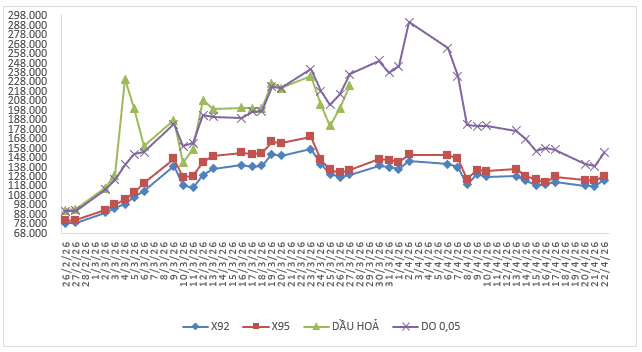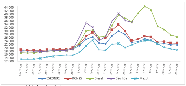 Biến động giá bán xăng dầu trong nước năm 2026 (31/12/2025 đến 23/4/2026)