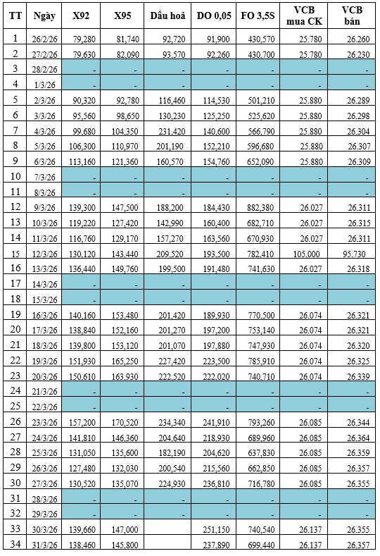 (Chi tiết tại bảng thống kê giá thành phẩm xăng dầu thế giới kèm theo)