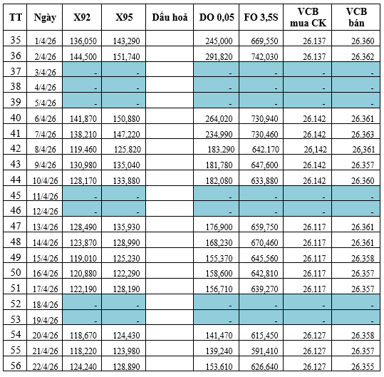 - Điều chỉnh giá bán các mặt hàng xăng dầu: Do thương nhân đầu mối kinh doanh xăng dầu, thương nhân phân phối xăng dầu quy định nhưng không muộn hơn 15 giờ 00’ ngày 23 tháng 4 năm 2026.