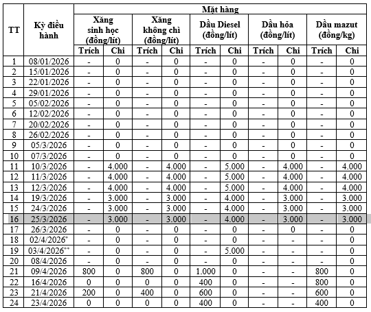 Kỳ điều hành này, ngày 23/4/2026, liên Bộ Công Thương - Tài chính quyết định áp dụng mức trích lập, chi sử dụng Quỹ bình ổn giá xăng dầu theo Quyết định số 969/QĐ-BCT ngày 23/4/2026 của Bộ trưởng Bộ Công Thương về việc áp dụng biện pháp sử dụng Quỹ bình ổn giá xăng dầu, thực hiện điều hành giá xăng dầu trong nước đảm bảo phản ánh đúng xu hướng biến động của giá xăng dầu thế giới; tiếp tục duy trì mức chênh lệch giá giữa xăng sinh học E5RON92 và xăng không chì RON95 ở mức hợp lý để khuyến khích sử dụng nhiên liệu sinh học; bảo đảm hài hòa lợi ích giữa các chủ thể tham gia thị trường. Cụ thể như sau: