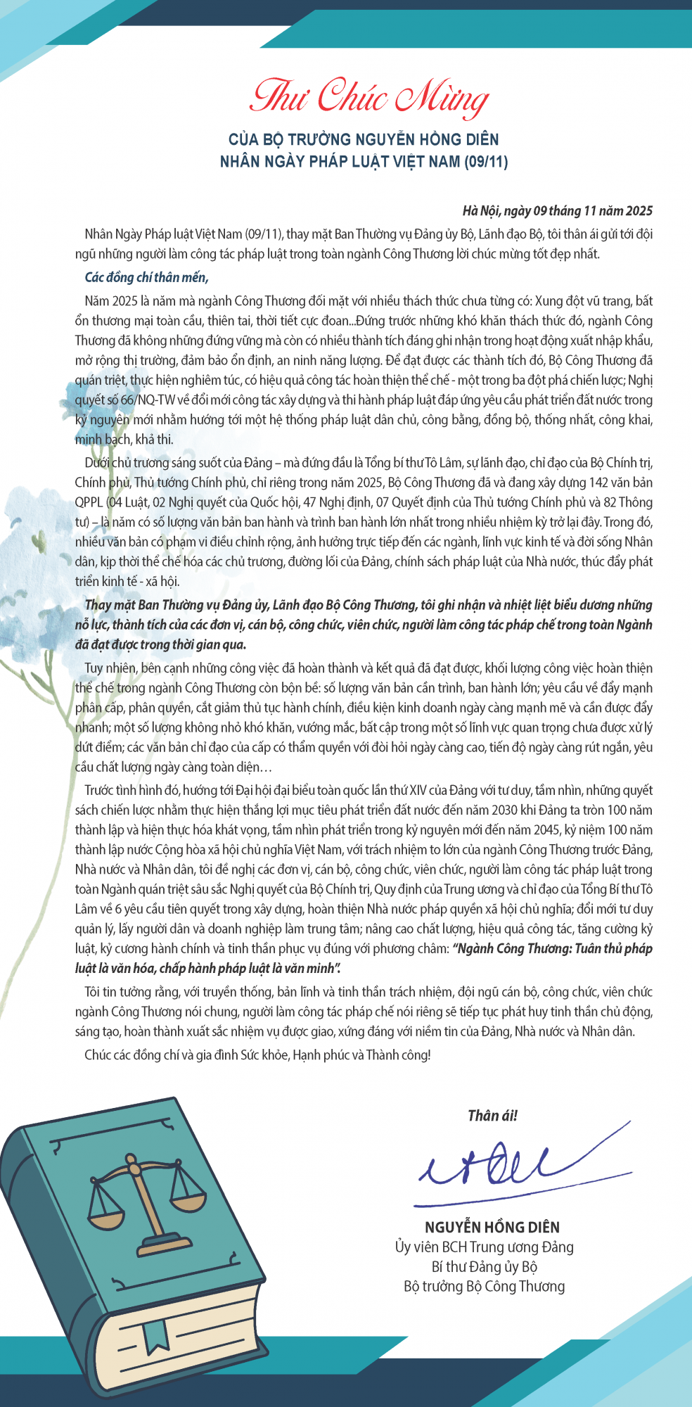 Nhân Ngày Pháp luật Việt Nam (09/11), thay mặt Ban Thường vụ Đảng ủy Bộ, Lãnh đạo Bộ, Bộ trưởng Nguyễn Hồng Diên đã gửi thư chúc mừng tới đội ngũ những người làm công tác pháp luật trong toàn ngành Công Thương lời chúc mừng tốt đẹp nhất.