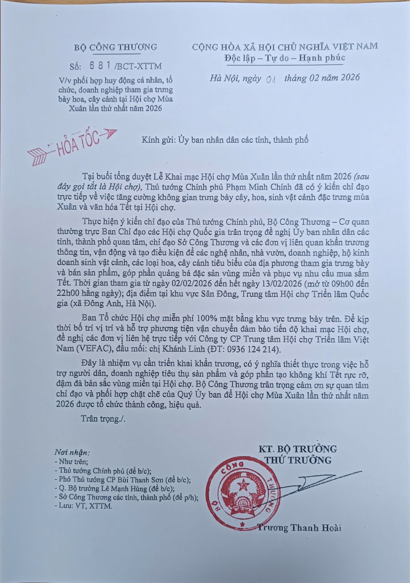 Đây là nhiệm vụ cần triển khai khẩn trương, có ý nghĩa thiết thực trong việc hỗ trợ người dân, doanh nghiệp tiêu thụ sản phẩm và góp phần tạo không khí Tết rực rỡ, đậm đà bản sắc vùng miền tại Hội chợ. Bộ Công Thương trân trọng cảm ơn sự quan tâm chỉ đạo và phối hợp chặt chẽ của Quý Ủy ban để Hội chợ Mùa Xuân lần thứ nhất năm 2026 được tổ chức thành công, hiệu quả.