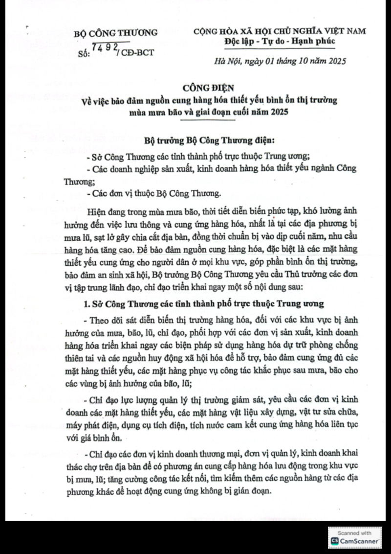 Tiêu đề văn bản | Công điện về việc đảm bảo nguồn cung hàng hoá thiết yếu bình ổn thị trường mùa mưa bão và giai đoạn cuối năm 2025 | ||
